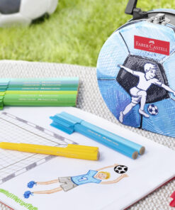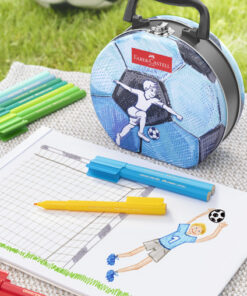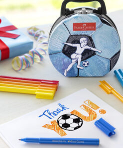 De viltstift met de speciale clip, de connector viltstift. Door speciale clip op de doppen kunnen de viltstiften eenvoudig in elkaar worden geklikt. De set heeft schitterende kleuren, wast uit de meeste textielsoorten. Deze stiften moedigen kinderen aan om geweldige tekentechnieken te ontwikkelen voor onbeperkte creativiteit. Leuk verpakt in hoogwaardig blik in tas (voetbal) vorm, ideaal voor opslag en voor onderweg. Het perfecte cadeau voor elke gelegenheid. Inhoud: 33 stuks assorti kleuren.
