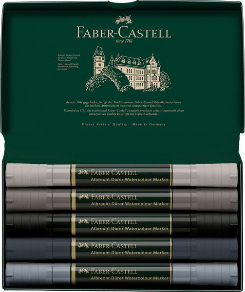Deze Albrecht Dürer aquarelmarkers op waterbasis zijn de moderne definitie van aquarelleren, een hoge kwaliteit tekeninstrument dat zowel spontaan schetsen als aquarelleren ondersteunt. De inkt op waterbasis is altijd klaar voor gebruik en is uitstekend bruikbaar in combinatie met water. Kwaliteit is één van Faber-Castell haar belangrijkste punten, dus deze aquarelmarker valt op door de hoge pigmentatie en hoge lichtechtheid. De kleuren volgen het Faber-Castell kleurnummeringssysteem en kunnen daarom op betrouwbare wijze gecombineerd worden met de potloden en Pitt artist pennen van Faber-Castell. Het grote voordeel van deze markers is dat de inkt niet doordrukt op het papier, bij alcohol markers gebeurt dit namelijk wel. Het product komt het beste tot zijn recht als je gebruik maakt van aquarelpapier. De marker heeft twee penpunten: Een penseelpunt en een vezelpunt, dit biedt de kunstenaar veel flexibiliteit in de persoonlijke tekenstijl. De penseelpunt is zacht en flexibel en door de richting van de punt op het papier te veranderen kan je met lijndiktes eindeloos variëren. De vezelpunt is uitermate geschikt voor wat meer gedetailleerd werk, de lijndikte is 1-2mm afhankelijk van de tekenhoek. Deze Albrecht Dürer aquarelmarkers zijn verkrijgbaar in 30 verschillende kleuren. Doos a 5 stuks . Kleuren: 199, 233, 235, 272, 273.