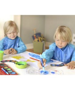 Kinderschort, ideale bescherming van de kleren voor kinderen vanaf 6 jaar. De schort is voorzien van een Velcro sluiting aan de achterkant. Elastiek aan de mouwuiteinden. Klein opbergvakje aan de voorkant, naamplaatje en ophangoog. Geschikt voor school en thuis. Gemaakt van 100% polyester en is uitwasbaar. Kleur blauw.