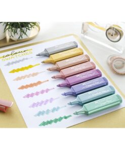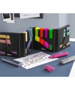 Inhoud 16 tekstmarkers in assorti kleuren. Met deze uitvouwbare deskset heb je een overzichtelijke presentatie op je bureau. De inkt is op waterbasis en garanderen een vlekvrije markering op alle standaard papiersoorten. De duurzame speciale tip markeert in drie lijndiktes voor uitstekende resultaten(1, 2 en 5 mm). De tekstmarkers worden horizontaal bewaard. De deskset is gemaakt van 100% karton.