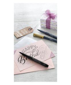 Mooie complete set voor iedereen die bijvoorbeeld zijn eigen wenskaarten wil maken. Uiteraard is dit ook geschikt voor bijvoorbeeld bulletjournaling of andere schrijf en teken creaties. Voor de fijne lijnen en kleine details bevat deze set 2 Pitt artist Pen Fineliners (S en 1.5) in de kleur zwart. Om de letters zo mooi mogelijk te maken door enkel het gebruik van een stift bevat deze set 5 Pitt artist Pennen met een Brush punt in de kleuren: 108 (Donger), 131 (koraal), 148 (Ice bla), 170 (mei groen), 199 (zwart). Voor de extra glanzende effecten bevat deze set ook 3 metallic markers in de kleuren: Heart of Gold, Berry Nice, Wanderlust. Inkt met hoge lichtbestendigheid. De lichtbestendigheid is in elke kleur met een sterretje voorzien: zeer goed LB/goed LB /voldoende LB. Lange levensduur en hoog comfort. Na het drogen permanent. Sneldrogend. Om deze set compleet te maken bevat deze set ook enkele templates voor wenskaarten en kadokaartjes en een handige gids met tips en instructies voor handlettering.