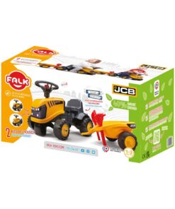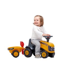 JCB zittractor voor peuters vanaf 1 jaar. Dit kleine voertuig met zijn vormen en rondingen zal kleine bouwers blij maken. De felle kleuren zijn perfect om je baby wakker te maken, die ook zijn motorische vaardigheden en evenwicht kan ontwikkelen terwijl hij plezier heeft! Zowel in de tuin als binnen dankzij het richtbare stuur met claxon is deze kleine tractor heel schattig uitgerust met een aanhangwagen met schep en hark. Dit is hun favoriete middel om hun favoriete deken van de slaapkamer naar de woonkamer te vervoeren of naar kleine uitjes in de buitenlucht, de zandbak! Slim, met een extra zelfklevende kit kan uw peuter de stijl en de aanpasbare kentekenplaat kiezen!