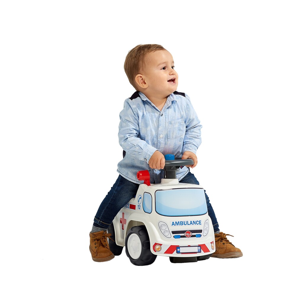 Heeft Doudou zijn enkel verdraaid? We moeten snel hulp sturen! Baby rent achter het stuur van zijn ambulance. Superhandig dankzij het richtbare stuur met claxon, manoeuvreert uw kind moeiteloos door het huis en waarschuwt hij voor zijn komst terwijl hij/zij zijn/haar grove motoriek ontwikkelt. Dankzij de opbergruimte onder de stoel kan je kleine held alles meenemen wat een echte dokter in deze situatie nodig heeft. En om dit schattige ritje helemaal uniek te maken, hebben we een aanpasbaar kenteken toegevoegd, waarop je als geen ander zijn voornaam kunt schrijven of een bijnaam kunt geven aan deze kleine ambulance.
