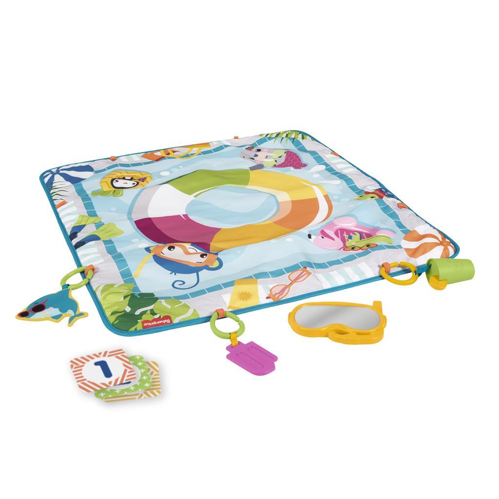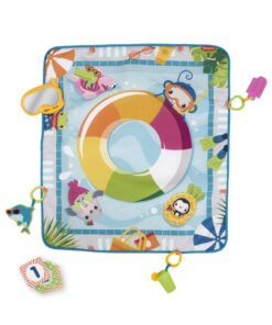 Grote speelmat voor baby’s met een zwembadthema en speelgoed. Machinewasbare speelmat geeft de illusie dat de baby in een zwembad drijft. Inclusief BPA-vrije ijslolly-bijtring, snorkelspiegel, kreukelspeelgoed met haaien en limonade-rammelaar. Wordt geleverd met 12 maandelijkse mijlpaalkaarten om het eerste jaar van de baby te documenteren. Tummy-time spelen en omgaan met het speelgoed helpt de kernspieren en hand-oog coördinatie te versterken. Geschikt voor kinderen vanaf geboorte.