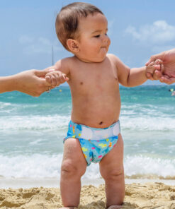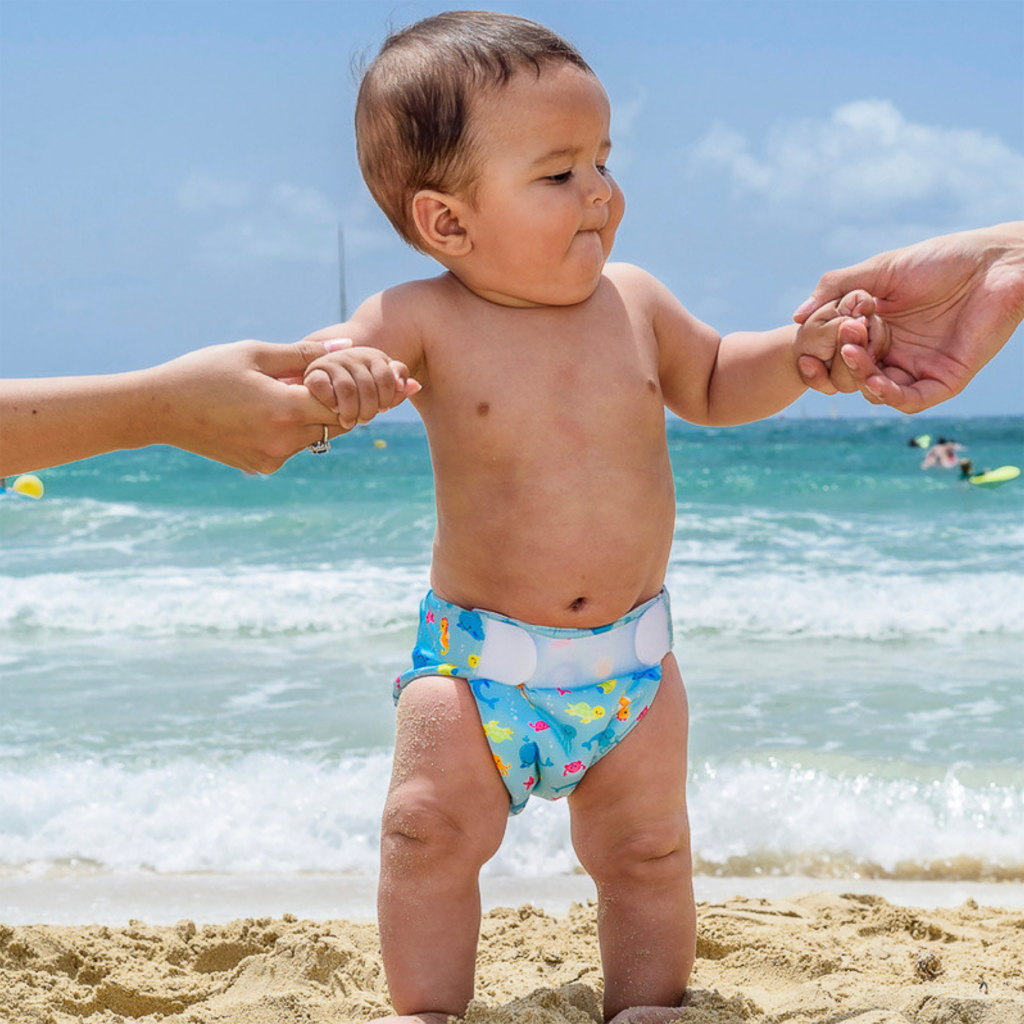 DeFreds Swim Academy wasbare zwemluier is zeer geschikt om mee te gaan babyzwemmen of wanneer je op vakantie gaat. In blauwe uitvoering met leuke zeedieren print. Maat 1: geschikt voor kinderen van 4 tot 9 kg. Deze zwemluier wordt kant en klaar geleverd: er hoeft geen booster of inlegger in. Omdat de wasbare zwemluiers er ontzettend leuk uitzien is een zwembroekje of zwempakje eigenlijk overbodig. Wasbaar en dus herbruikbaar. Met zacht microvezel binnenmateriaal voor een comfortabele pasvorm en voorzien van elastische en nauwsluitende klittenbandsluitingen voor een optimale afstelling en lekvrije pasvorm. Verkrijgbaar in blauw en roze in twee verschillende maten. Ga je veel zwemmen? Dan is het handig om twee herbruikbare zwemluiers in de zwemtas te hebben. Mocht er dan een ongelukje gebeuren tijdens het zwemmen, heb je nog een schone zwemluier om mee verder te zwemmen.