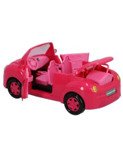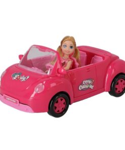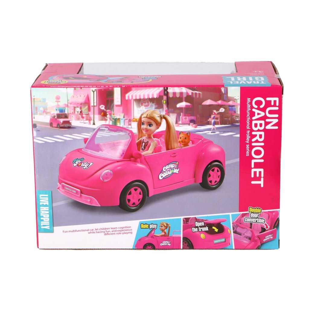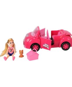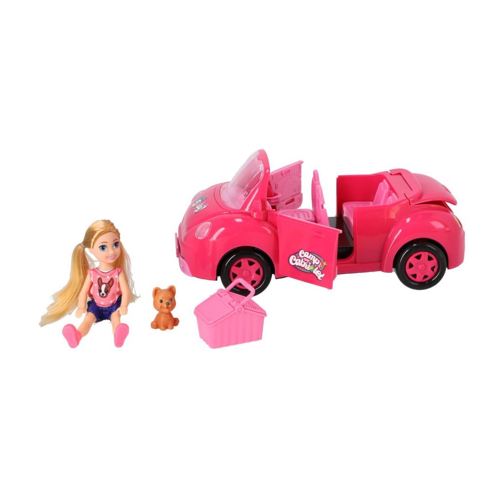 Roze cabriolet van stevig kunststof, waarvan de deuren en kofferbak open kunnen. Inclusief een picknickmand, een speelpop en een schattige puppy. De auto is ongeveer 25 cm groot. Geschikt voor kinderen vanaf 3 jaar.