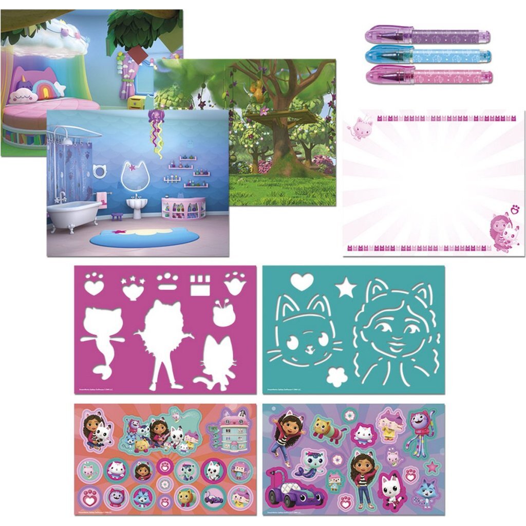 Gabby’s Dollhouse activiteitenboek met 20 voorbedrukte vellen, sjablonen, stickers, speelachtergronden en 3 gelpennen. Geschikt voor kinderen vanaf 3 jaar.
