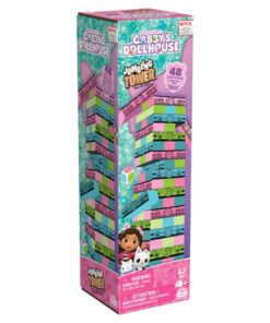 Maak je klaar om de Gabby’s Poppenhuis toren te bouwen, maar wees niet degene die hem laat omvallen of het is game over in dit Jumbling Tower-spel. Speel met 2 spelers of een hele groep. Dit kinderspel heeft 48 houten blokjes in blauw, roze en groen met Gabby’s Poppenhuis-pictogrammen en bevat je favoriete pups, waaronder Pandy Poek en Cakey. Om te spelen, rol je met de dobbelsteen om een kleur te bepalen en verwijder je een houten blokje van die kleur waar ook maar in de toren, behalve op het hoogste niveau. Eenmaal verwijderd, plaats je het blokje op de top van de toren in de goede richting. Blijf om de beurt spelen totdat iemand de toren omver laat vallen. Tijdens het spel mag je maar één hand gebruiken bij het verwijderen en plaatsen van blokjes. Je mag een blokje aanraken om te zien of het los zit. Als je het tijdens het controleren verplaatst en niet gebruikt, leg je het blokje terug in zijn oorspronkelijke positie. Inhoud: 48 houten blokjes, 1 dobbelsteen, 1 instructieblad