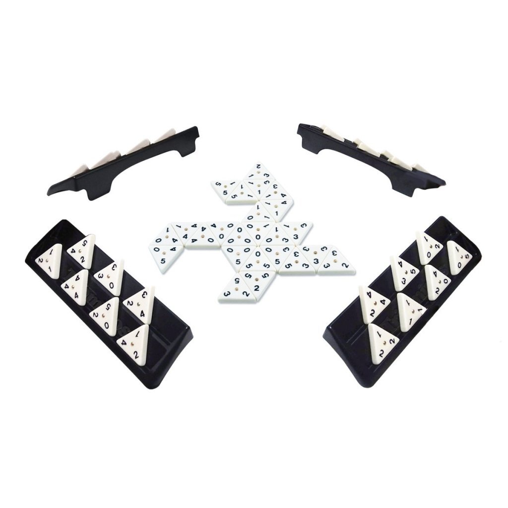 Een handige uitbreiding op het originele Triominos spel! Nu voor op reis. Een tactisch spel met driehoekige, genummerde stenen. Zoek je kansen, leg ze snel aan en scoor zo veel mogelijk punten. Bij dit spel gaat het niet alleen om inzicht maar ook om tactisch spelen; Sommige aangelegde figuren leveren je namelijk ook veel punten op! Het spel begint door een willekeurige steen op tafel te leggen en de speler scoort ook de waarde van deze steen. Iedere speler probeert tijdens zijn beurt één van zijn Triominos stenen passend aan te leggen. De stenen mogen passend aangelegd worden aan alle kanten van alle stenen die reeds op tafel liggen. Het spel eindigt wanneer een speler al zijn stenen van zijn plankje heeft gespeeld. Door het leggen van bepaalde figuren kan men extra punten verdienen. De winnaar is uiteindelijk degene met de meeste punten. Geschikt voor2 tot4 spelers vanaf 6jaar.