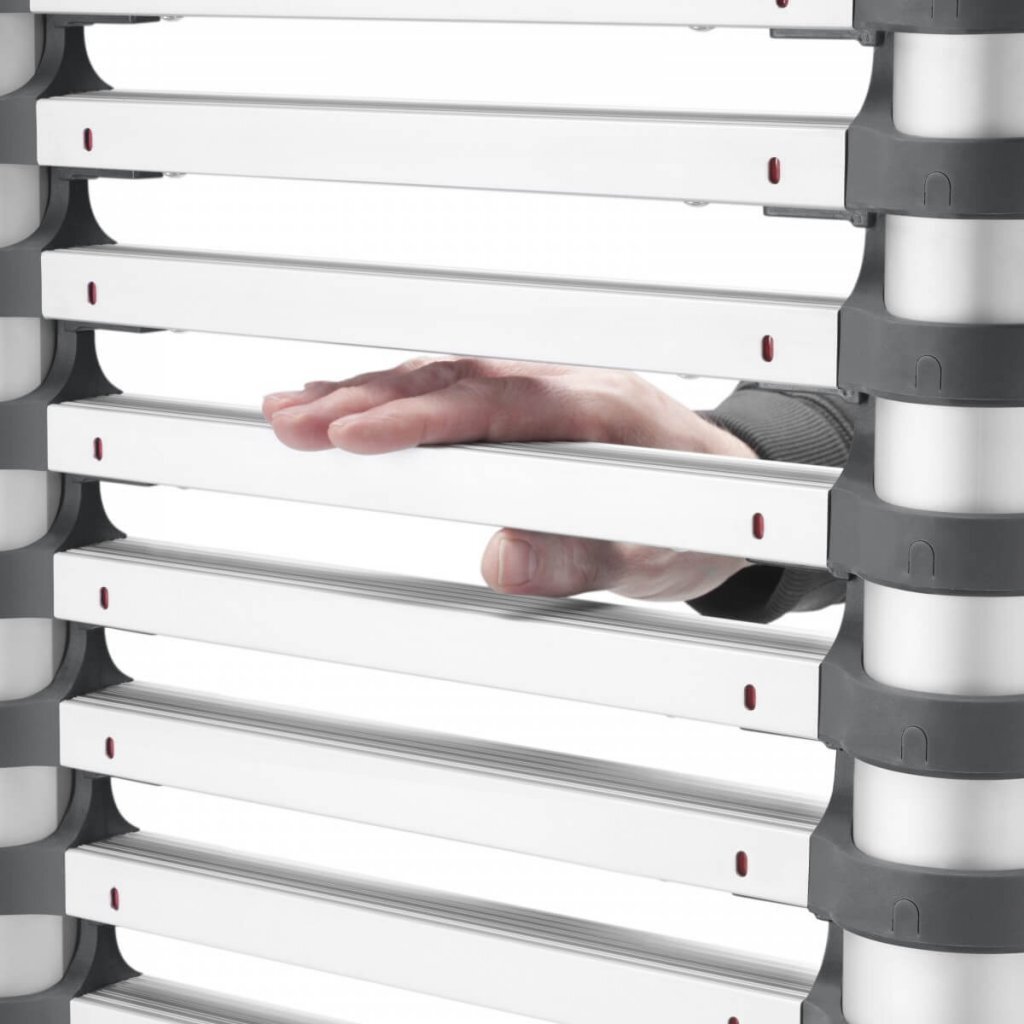 - Dankzij het unieke ontgrendelingssysteem met ƩƩn hand kan de ladder eenvoudig en veilig worden ingetrokken