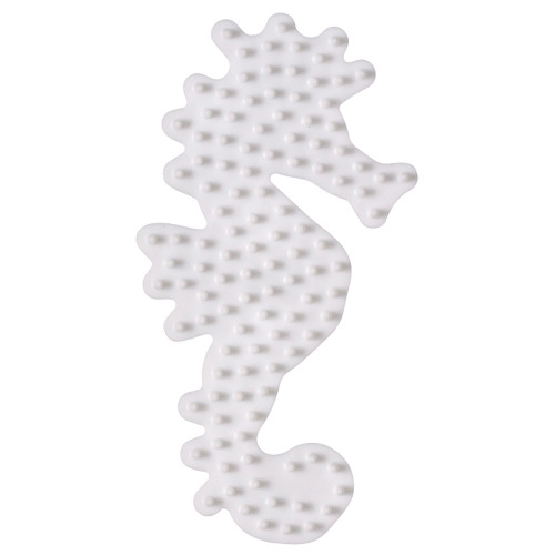 Strijkkralen kun je in bijna elk gewenst patroon leggen en dan door middel van strijkpapier en een strijkijzer samensmelten. Maar daarvoor heb je natuurlijk wel een grondplaat nodig. Witte grondplaat in de vorm van een zeepaardje.