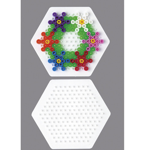 Strijkkralen kun je in bijna elk gewenst patroon leggen en dan door middel van strijkpapier en een strijkijzer samensmelten. Maar daarvoor heb je natuurlijk wel een grondplaat nodig.Zeshoekige kleine grondplaat.