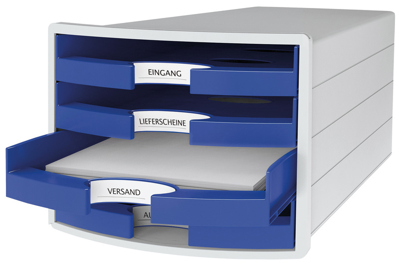 Ladenkastje van antistatisch polystyrol. Lichtgrijze ombouw met 4 open laden. Voor het bewaren, verzamelen of sorteren van al uw bescheiden die u op uw werkplek onder handbereik wilt hebben. Laden voorzien van uittrekblokkering, met elegant geĆÆntegreerde labelhouders. Beschrijfbare labels worden meegeleverd. Het zeer stabiele ladenkastje staat op 4 rubberen voetjes en is tevens geschikt om er een beeldscherm op te plaatsen. Afmetingen ladenkastje: 280x367x235mm (bxdxh), binnenmaat lade: 240x325x37mm (bxdxh). Verpakt per stuk in een doos. Kleur blauw.