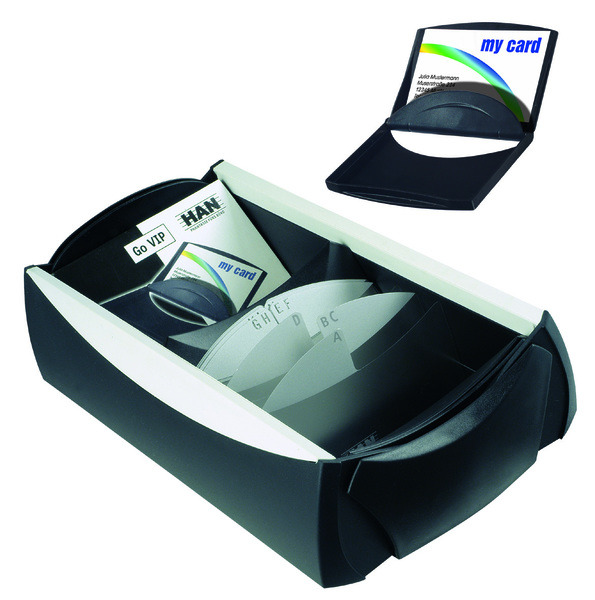 Modern design visitekaartenbox, gemaakt van hoogwaardige materialen. Dankzij gepatenteerde klapbare deksel, geruisloos te openen en te sluiten. Door de verstelbare kaartsteunen groeit de orde mee, tot ca. 500 visitekaartjes. Inclusief tabkaarten A-Z. De box is voorzien van elastische voetjes. Bij elk visitekaartenbox wordt een visitekaartmapje ‘GO VIP’ voor ca. 20 visitekaartjes meegeleverd. Deze is ook apart te bestellen. Kleur zwart / grijs.