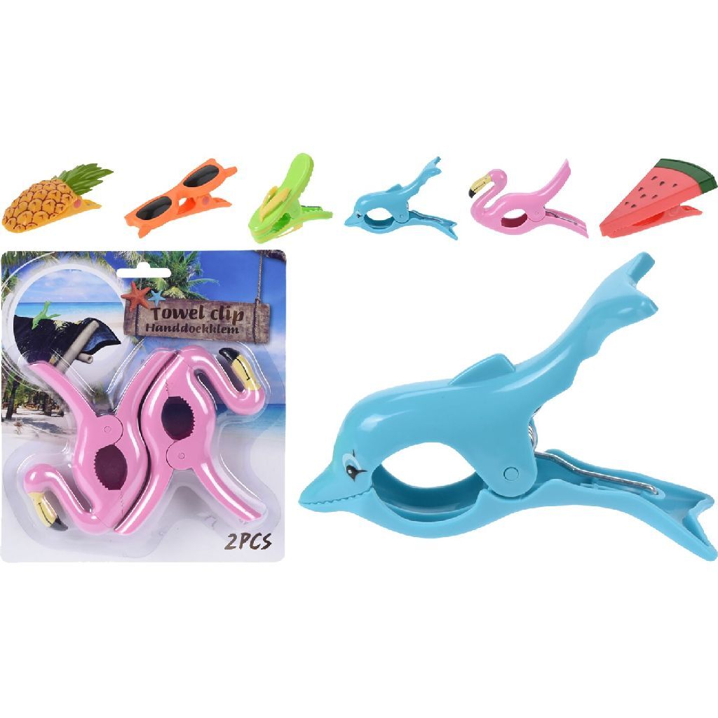Set van 2 clips warmee u eenvoudig uw badlaken vastzet op uw stoel. Leverbaar als dolfijn, flamingo, slipper, watermeloen, ananas of zonnebril. U kunt niet kiezen, maar ontvangt een willkeurige uitvoering.