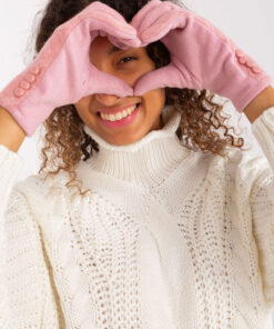 Elegante dameshandschoenen van stof met een decoratief geometrisch patroon. Decoratieve knopen aan de polsen. Wijsvinger met geborduurde bloem, zodat je je telefoon kunt bedienen zonder de handschoenen uit te doen.