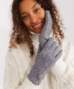 Elegante dameshandschoenen van geïsoleerde stof met decoratief geometrisch patroon. Decoratieve gecoate knopen aan de polsen. Wijsvinger met geborduurde bloem, zodat je je telefoon kunt bedienen zonder je handschoenen uit te doen.