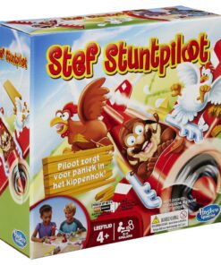 Stef stunt en stuitert en duikt maar raak. Hij vliegt steeds langs jouw kippenhok. Kun jij jouw kippen beschermen tegen Stef en zijn stuiterende stuntvliegtuig? Voor 2 tot 4 spelers vanaf 4 jaar.