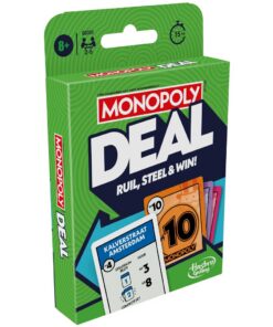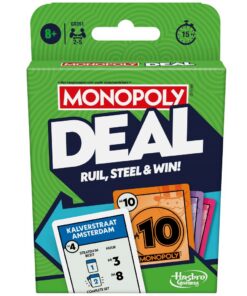 Ruil, steel en win met dit Monopoly Deal-kaartspel! Wees de eerste speler die 3 complete sets met Straatkaarten heeft in 3 verschillende kleuren en win. Dit kaartspel telt 110 kaarten: Straatkaarten, Jokerkaarten, Actiekaarten en Geldkaarten. Jokerkaarten helpen spelers stratensets te maken. Actiekaarten gooien het spel overhoop: spelers kunnen hiermee huur innen, bezittingen stelen en ruilen en meer. En spelers betalen hun schulden met Geldkaarten. Dit kaartspel is eenvoudig te spelen en klaar te zetten, geschikt voor 8 jaar en ouder en duurt slechts 15 minuten! Of je nu een leuk spel zoekt voor kinderen en volwassenen, een gezinsspel of reisspel voor kinderen, dit is een geweldige keuze voor elk moment.