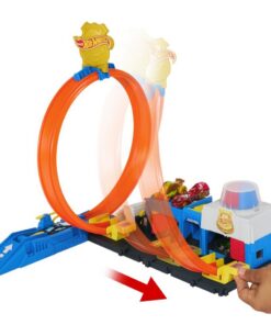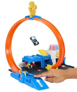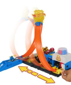 Rijd de meegeleverde 1:64 schaal gegoten speelgoedpolitieauto in de lanceerder waar een flexibele slang is om te tanken voordat je in actie komt. Schuif de lusbaan naar een van de vier paden, elk met een andere stunt of uitkomst. Parkeer maximaal vier voertuigen op de set en bevestig andere banen en speelsets voor open einde spel. Eén auto is inbegrepen, extra voertuigen en banen worden apart verkocht. Kleuren en decoraties kunnen variëren. Geschikt voor kinderen vanaf 4 jaar.