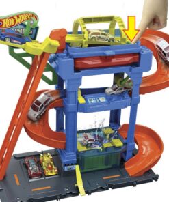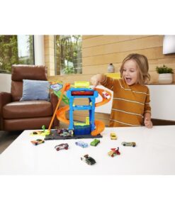 De Hot Wheels City Tunnel Twist Car Washmaakt de kleurveranderende actie extra spannend met een innovatieve, water sproeiende tunnel! Kids rijden de meegeleverde Hot Wheels Color Shifter auto naar de ingang, waar ze de auto met de lift, die ze zelf bedienen, naar de bovenste verdieping brengen. Wanneer de auto de draaiende tunnel van de wasstraat inrijdt, sproeit een douche warm water en zie je de decoraties van de auto meteen veranderen! Rij daarna de helling af door de schuimrol en voorbij het vacuüm om de details te voltooien. Duik ten slotte in het station met ijskoud water waar de auto zijn originele kleuren weer terugkrijgt. Herhaal de magie steeds opnieuw. Afwijkende kleuren en versieringen mogelijk. Geschikt voor kinderen vanaf 3 jaar.