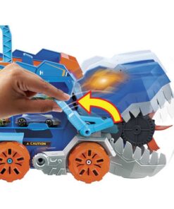 - Transformeer de Hot Wheels City vrachtwagen van een autovrachtwagen met plaats voor meer dan 20 auto’s in een grommende en stampende T-Rex