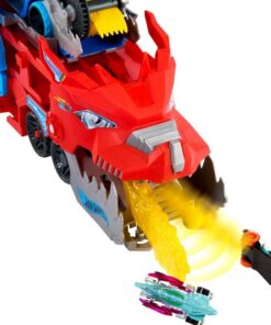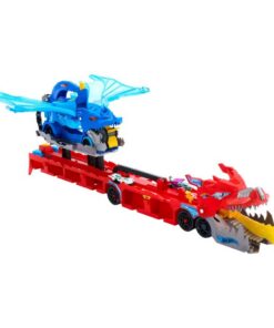 Scheur de strijd tegemoet met deze reusachtige draaktruck met een extra, afneembare draak die speelgoedauto’s opeet! Nadat je met de vuurspuwende draak auto’s hebt uitgeschakeld, maak je de kleinere draak los en verander je de grote draak in een racebaan! Druk op de knop om zijn vleugels te laten bewegen zodat hij op een echte draak lijkt, en klap ze daarna in zodat hij auto’s kan opeten. Keer terug naar de grote draak en zet de auto’s in de lanceerders waarna ze zij aan zij de banen op kunnen racen! De truck bevat twee auto’s (schaal 1:64), maar je kunt meer dan 20 auto’s op en in de twee draken stallen. Geschikt voor kinderen vanaf 4 jaar.