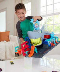 Kinderen besturen het meegeleverde voertuig met kleurverrassing over de helling en in de bek van de haai. Druk vervolgens op de kop van de haai om de kleur van het water te veranderen en de decoraties op de auto te onthullen. Stop bij de haai en kijk hoe de auto aan de binnenkant racet terwijl het overtollige water wegstroomt. Druk op de staart van de haai om auto’s vanuit de parkeergarage of in de ijskoude watertank te lanceren voor een kleurverrassing. Verander de kleuren van de auto terug door opnieuw door de wasstraat te gaan. Gedetailleerde baan om nog meer verhalen te vertellen met beweegbare poorten en een schuimroller die net uit een echte autowasstraat lijkt te komen. De set kan in tweeën worden gevouwen voor eenvoudig opbergen en is voorzien van een handvat om hem te helpen dragen en het overtollige water af te voeren. Geschikt voor kinderen vanaf 3 jaar.