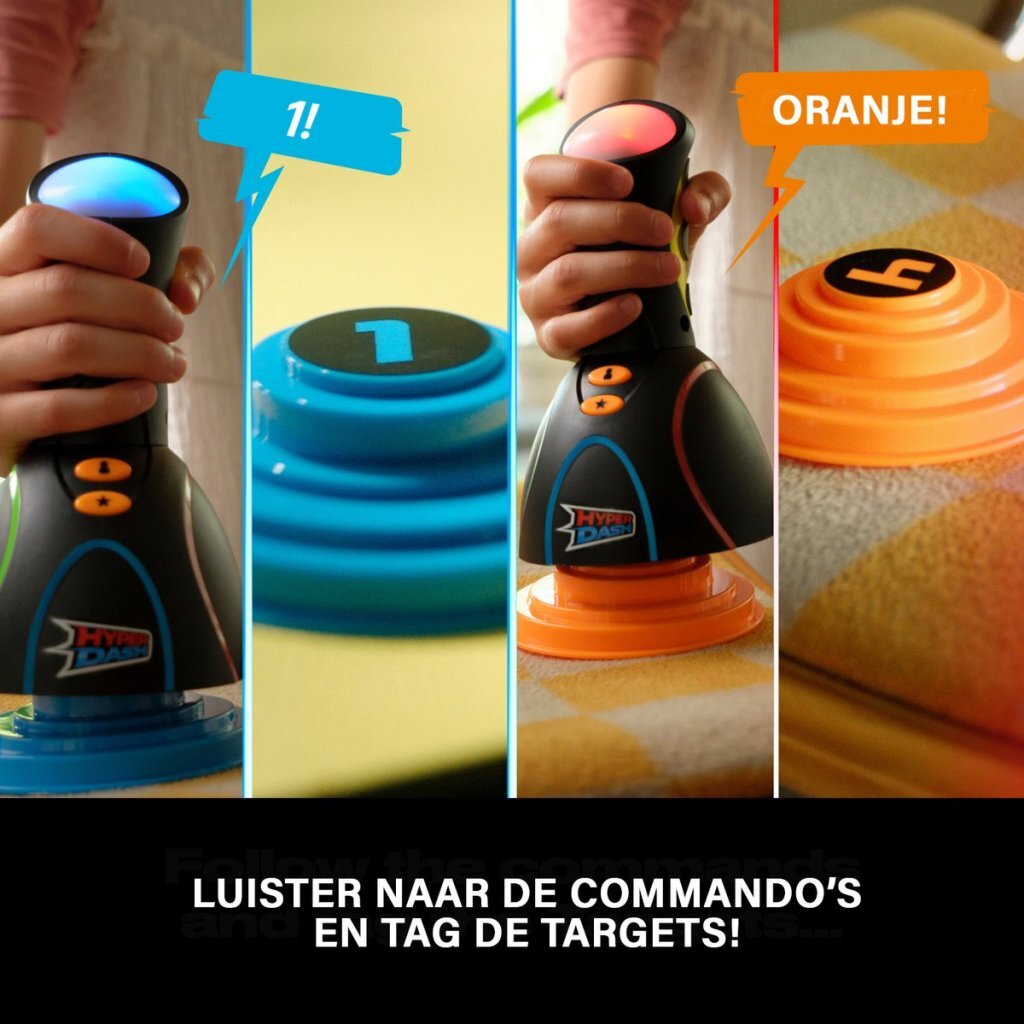 Hyper Dash is een elektronisch racespel, waar je reactievermogen optimaal wordt getest! Het spel bestaat uit de elektronische Hyper Dash Tagger en 5 gekleurde Targets met nummers erop. Maak een speelveld met de 5 Targets. Er zijn spelniveaus, van makkelijk tot uitdagend. Op niveau 1 tag je alleen gekleurde targets. In niveau 2 worden kleuren Ć©n cijfers gecombineerd. Op niveau 3 volgen razendsnelle opdrachten met meerdere doelen tegelijk! De levels worden steeds moeilijker. Speel solo of in teamverband en race tegen de klok Ā kies 30, 60 of 90 seconden. Luister goed naar je Tagger en houd je ogen op het licht: ĀGroen! 5! Rood! 2!Ā Ā en tag zo snel mogelijk de juiste targets. Wie reageert het snelst? Wie scoort het hoogst? Hyper Dash is actie, fun Ć©n competitie voor jong en oud! Ben jij klaar om te racen? Let’s Hyper Dash!
