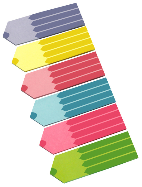 Info page marker 18x55mm, 6 x 25 stuks, in 6 kleuren (violet, geel, rood, blauw, roze en groen), geplakt op kaart.
