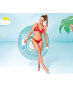 Opblaasbare lounge stoel voor in het water verkrijgbaar in twee kleuren. Heeft een diameter van 119 cm. Bevat handvaten aan de zijkant voor extra grip en een bekerhouder. Metreparatiesetje. Maximaal draagvermogen 100 kg. U kunt niet kiezen, maar ontvangt een willekeurige kleur.