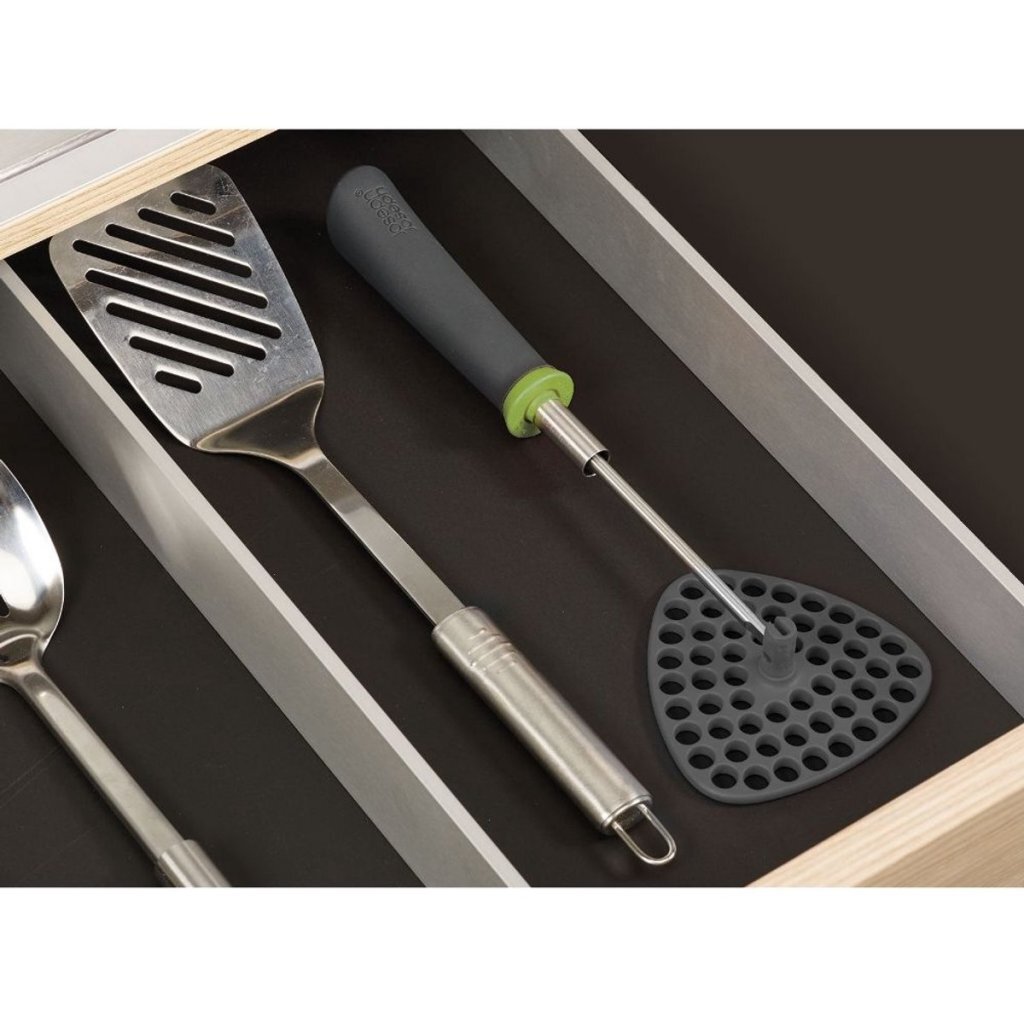 Het bijzondere aan deze aardappelstamper is zijn inklapbare kop waarmee hij enorm ruimtebesparend is en zo in de keukenlade past. De nylon kop van de stamper kan voor gebruik eenvoudig worden vergrendeld met de RVS huls die om de steel zit. Dankzij de speciaal ontworpen vorm past de stamper perfect langs de rand van iedere pan waardoor geen enkele aardappel wordt overgeslagen. Verder zorgt de anti-slip handgreep voor extra comfort tijdens het gebruik. Na gebruik kan de pureestamper worden schoongemaakt in de vaatwasser. Kleur: limoen groen/grijs.