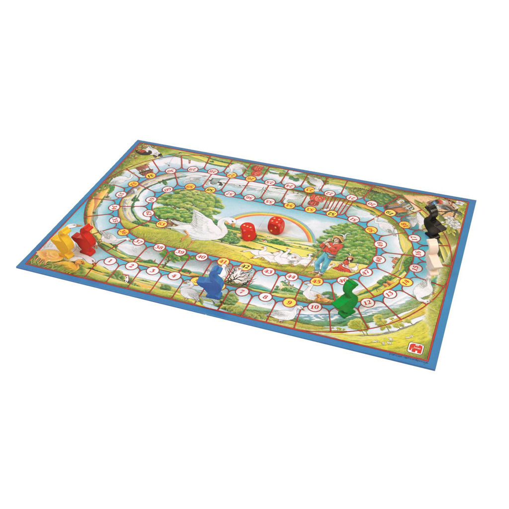 Oudhollands ganzenbord met 6 grote houten ganzen en 2 dobbelstenen