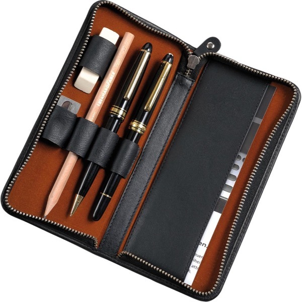 Leder pennetui met ritssluiting voor 3 stuks met 2 extra houders voor USB. Hoogwaardige bruine voering. Kleur zwart. Zonder inhoud!