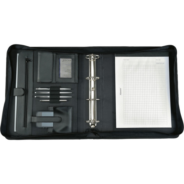 Kunstlederen conferentiemap Alassio Arezzi finetouch A4 zwart met ringbandmechaniek en handvat. Voorzien van schrijfblok, 2 opbergvakken waarvan een met ritssluiting, 4 pennenhouders en visitekaarthouder. Geheel afsluitbaar met ritssluiting. Afmeting 36x30x6cm.