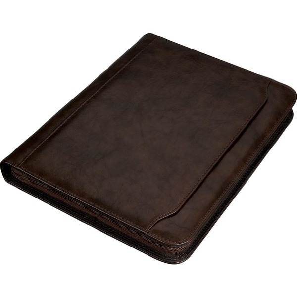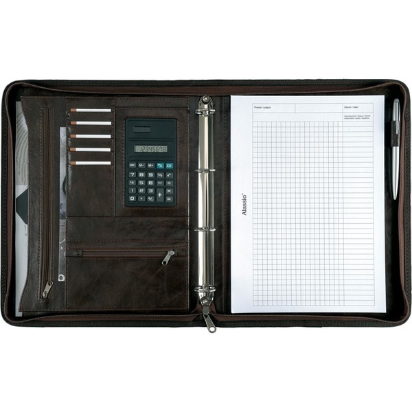 Conferentiemap met gemarmerde uitvoering. Een A4 opbergvak aan de buitenzijde. Binnenzijde: met ringmechaniek, rekenmachine, notablok, pennenhouder, A4 opbergvak, 2 compartimenten met ritssluiting en 5 visitekaarthouders.