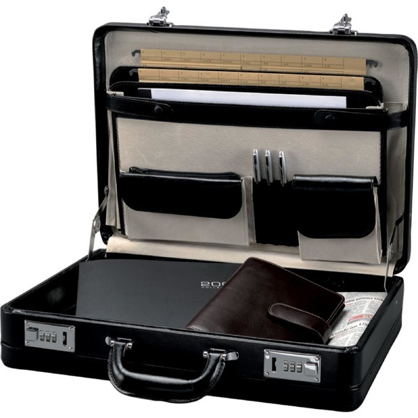 Pilotenkoffer met uitvouwbaar vak, twee sloten met cijfercombinatie. Binnenafwerking: drie pennenhouder, twee A4-vakken, twee opbergvakken.