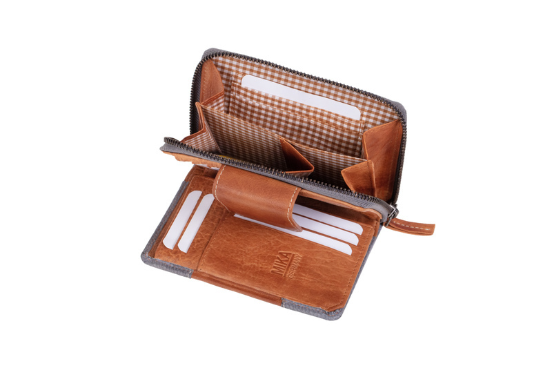 Staand formaat, dertien kaartsleuven, drie gaasvakken, vijf sleuven, twee steekvakken, muntvakjes met rits en twee kaartsleuven
