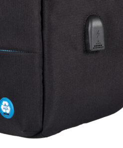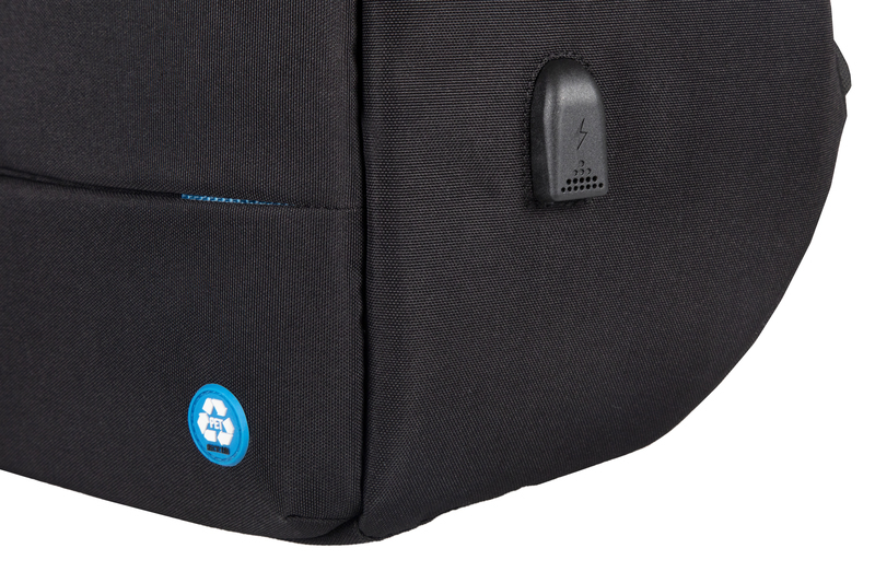 Zwarte rugzak van gerecycled PET, Safepack, met USB laadpoort, trolleyband, ritsvak op de schouderband en voorkant. Binnenkant (blauw) met gewatteerde vakken voor laptop tot 15,6″ of tablet, 3 insteekvakken en vak met ritssluiting.