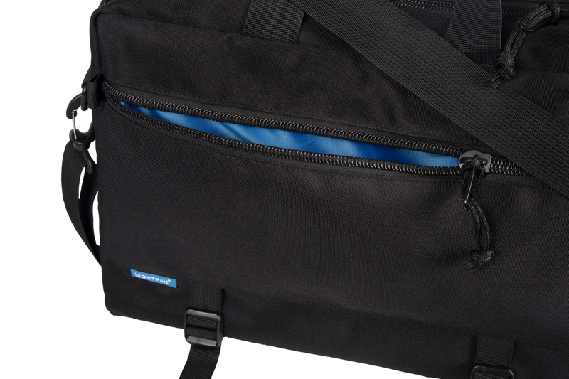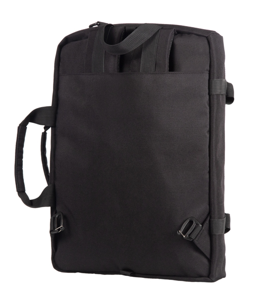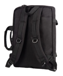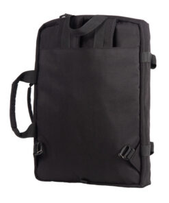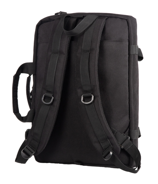 Zwarte 3-in-1 tas: rugzak, laptoptas en schoudertas in 1! Gemaakt van gerecycled PET. Met afneembare schouderriem. Groot gewatteerd laptopvak, 2 insteekvakken, 2 pen/stiftlussen en vak met rits.