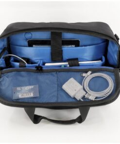 - De achterkant van de tas heeft een groot gewatteerd laptopvak en USB-oplaadpoort