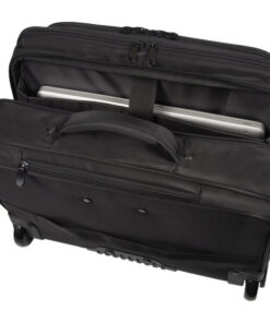 Zwarte laptoptrolley van gerecycles PET. Met volledig inschuifbaar trolleysysteem, trolleyband, handvat, 2 kwaliteitswielen, haken voor schouderriem, flessenhouder. Binnenkant: gewatteerd hoofdvak voor laptop tot 17″ of tablet, ruimte voor ordner of documenten, vak met rits en 2 A4 binnenvakken, vak met rits voor 3 pennen/stiften, 2 inschuifvakken. Voorvak met rits.