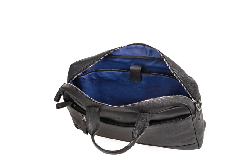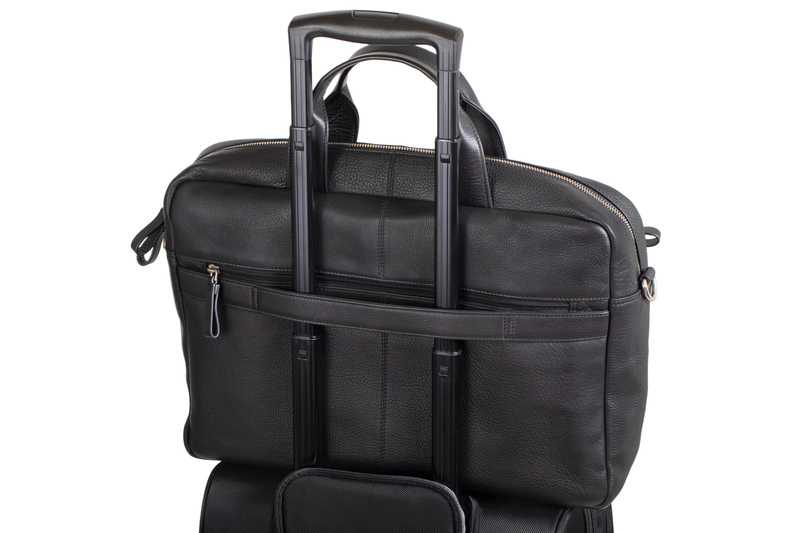 Laptoptas TIBER regelbare en afneembare schouderriem, handvat, hoofdcompartiment met rits, twee compartimenten met rits vooraan, compartiment met rits op de achterzijde, trolley riem. Binnen compartiment: compartiment met rits, opberg vak voor mobile zwart leer ca. 28 x 41 x 9,5 cm. Binnenafmetingen laptop vak: ca. 25 x 36,5 x 3 cm