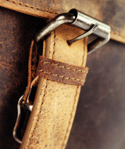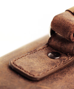 De aktetas is voorzien van een afneembare en verstelbare schouderriem, handvat en flap met veiligheidsslot. De achterkant heeft een compartiment met rits en het compartiment aan de voorkant een rits met organiser gedeelte, twee pennenhouders, drie visitekaart vakken en een vak voor een smartphone. Binnenin: hoofdcompartiment met gevoerd compartiment voor laptop en rits. 28,5×37,5x13cm. Echt leer, bruin.
