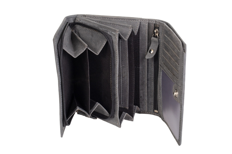 Portefeuille voor dames RFID Met TFID folie, hoog model, negen kredietkaart vakken, drie opbergvakken, compartiment met doorzichtige folie, opberg vak met rits, twee grote opbergvakken, ƩƩn opberg vak voor biljetten, opberg vak voor munten met rits. grijs leer ca. 13 x 10,5 x 2,5 cm