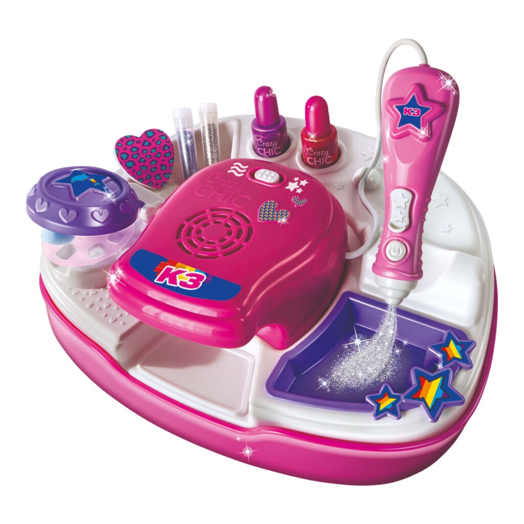 Een nail art studio om een perfecte manicure te creëren, met de kleuren en de stijl van K3! De console beschikt over alles wat je nodig hebt: nagellak, droger, apparaat om glitter aan te brengen, en veel meer! Breng je persoonlijkheid en verbeelding naar voren door het creëren van fantastische en originele nail art looks. K3 wacht op je voor het creëren van hun volgende nail art look! Alle onderdelen zijn veilig en getest.