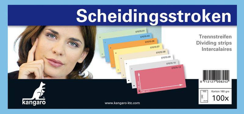 Scheidingsstrook vervaardigd uit 180 grs zuurvrij recycled karton, onbedrukt, 2-gaats ponsing h.o.h. 8 cm aan 1 korte zijde. Kleur blauw. Pak a 100 stuks.