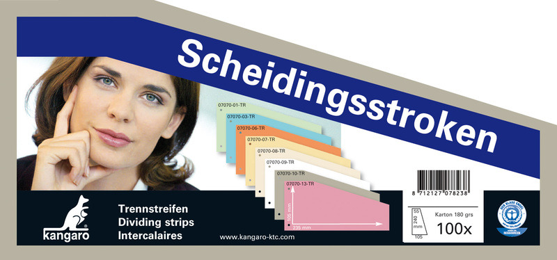 Scheidingsstrook, trapeziumvormig vervaardigd uit 180 grs zuurvrij recycled karton, onbedrukt, 2-gaats ponsing h.o.h. 8 cm aan 1 korte zijde. Kleur grijs. Pak a 100 stuks.