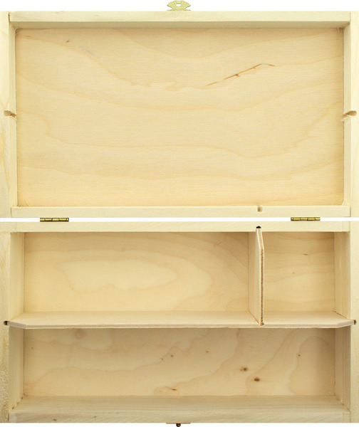 Tekendoos van ongelakt hout met een 3-vaks indeling.Formaat 25x14x6,5cm.
