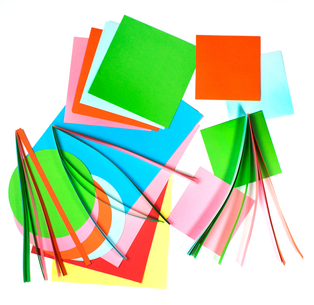 60 vlechtstroken, 24 vouwblaadjes groot, 24 vouwblaadjes klein, 20 vouwblaadjes rond, 12 vel gekleurd papier